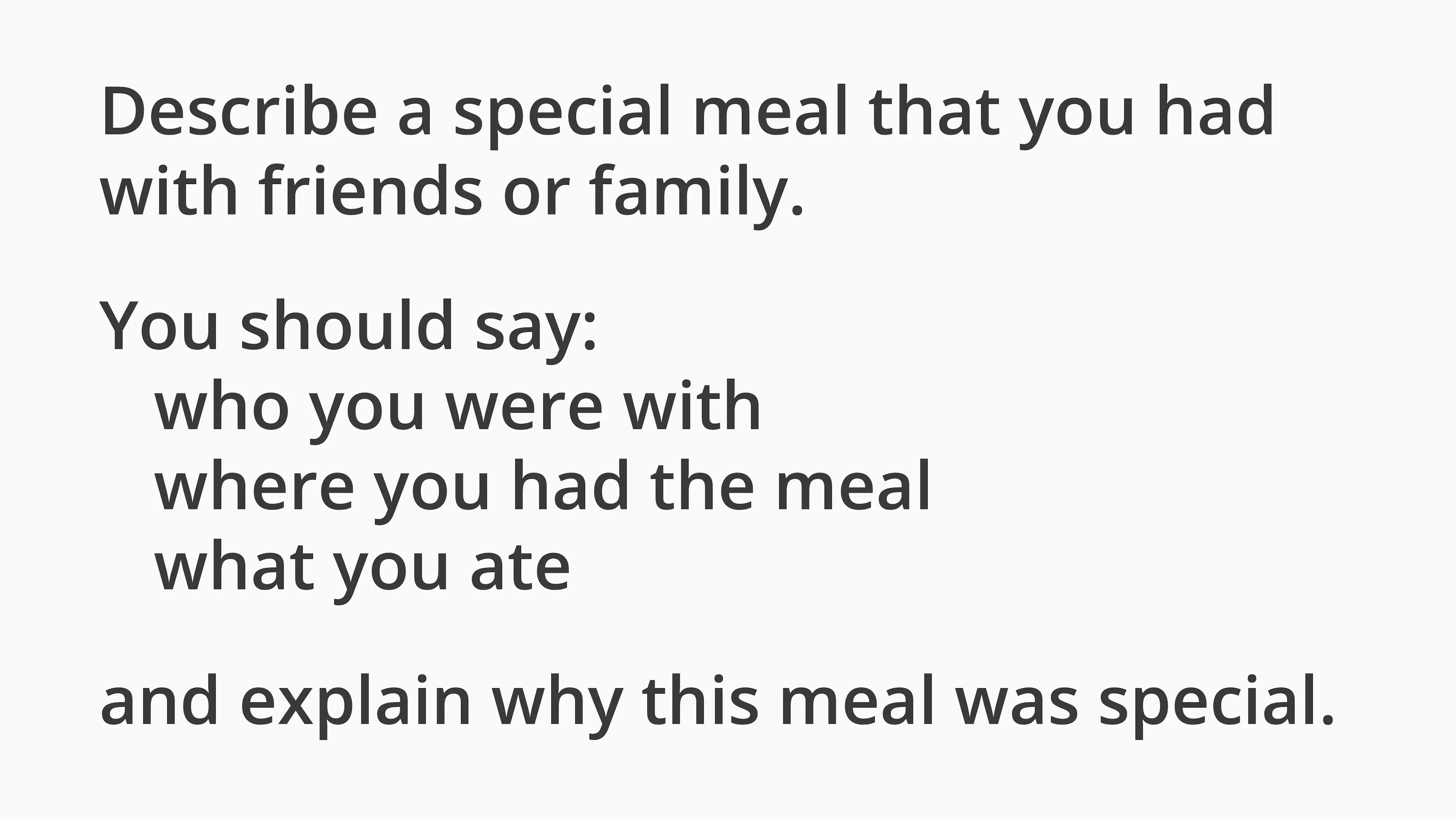 – Now, I’m going to give you a topic, and I’d like you to talk about it for one to two minutes. Before you talk, you’ll have one minute to think about what you’re going to say. You can make some notes if you wish. Do you understand? Here’s some paper and a pencil for making notes, and here’s your topic. Please don’t write anything on the booklet. I’d like you to describe a special meal that you had with friends or family.