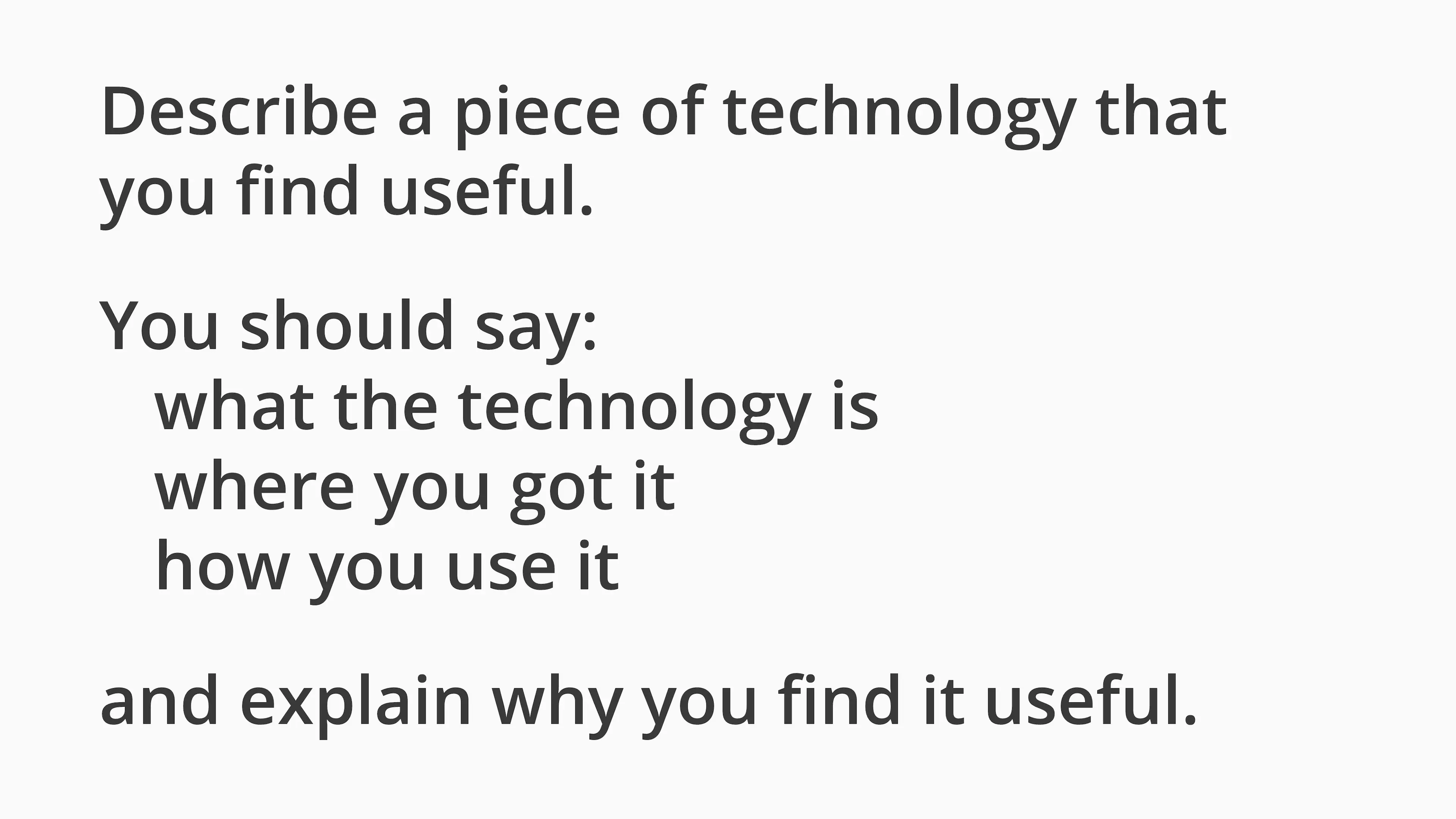 – Now, I’m going to give you a topic, and I’d like you to talk about it for one to two minutes. Before you talk, you’ll have one minute to think about what you’re going to say. You can make some notes if you wish. Do you understand? Here’s some paper and a pencil for making notes, and here’s your topic. Please don’t write anything on the booklet. I’d like you to describe a piece of technology that you find useful.